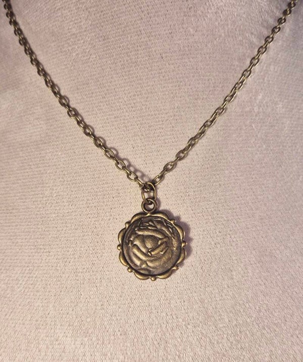 Pendentif en bronze décoré d'une rose sur l'arrière, livré avec une chaîne en bronze.