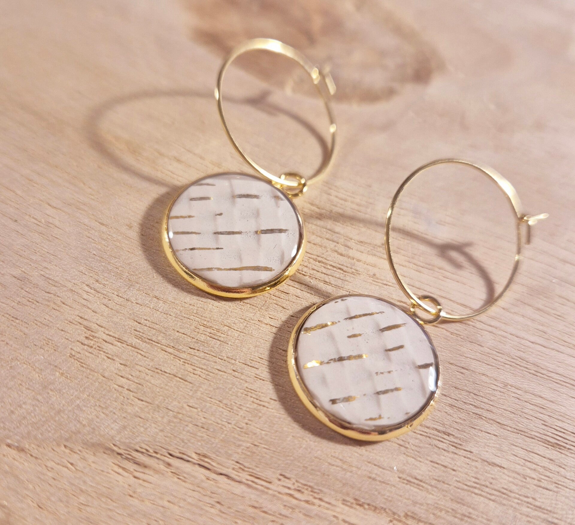 Offrez-vous l’élégance du fait main avec ces boucles d’oreilles artisanales conçues à partir de fragments d’assiettes anciennes soigneusement sélectionnés.