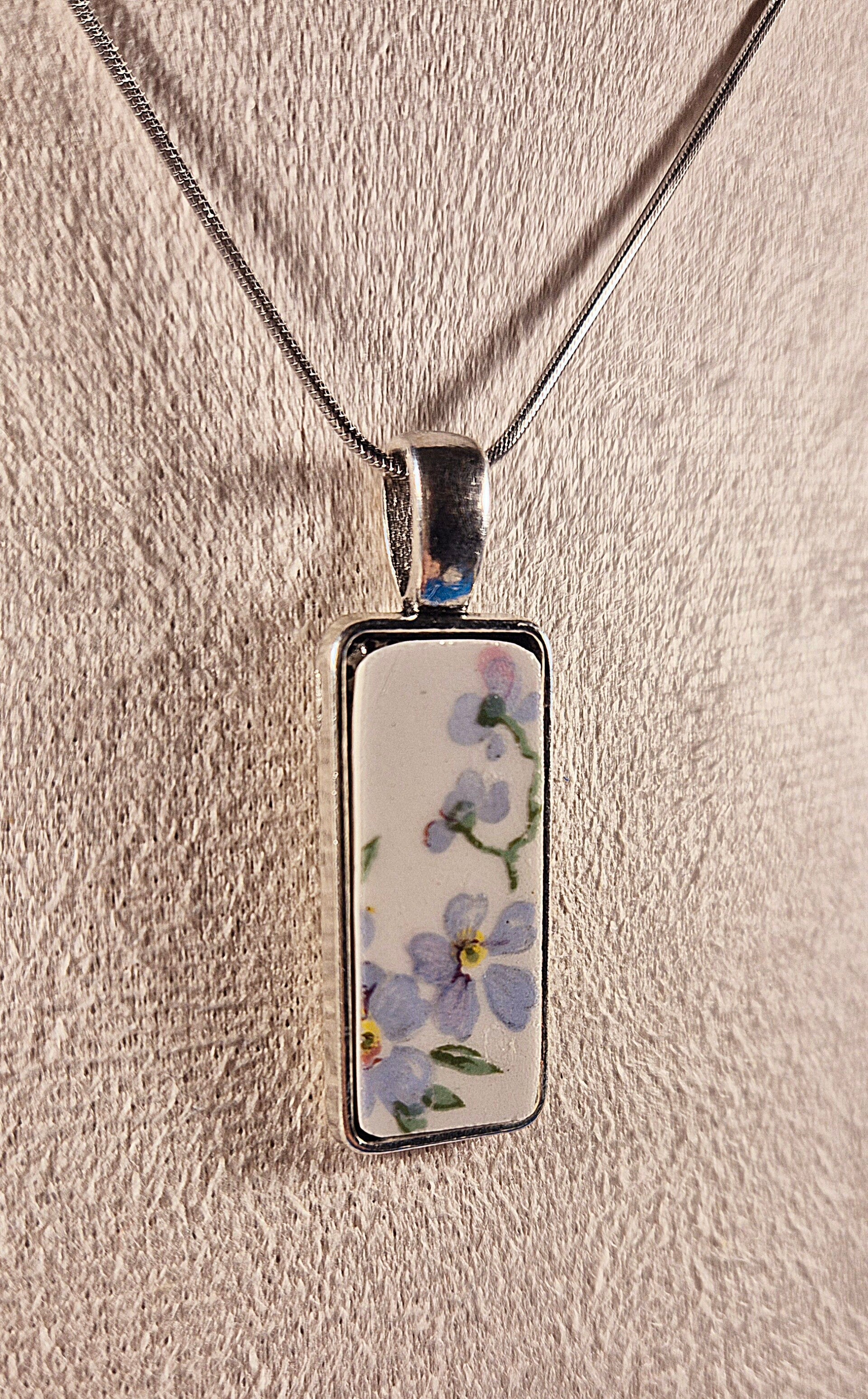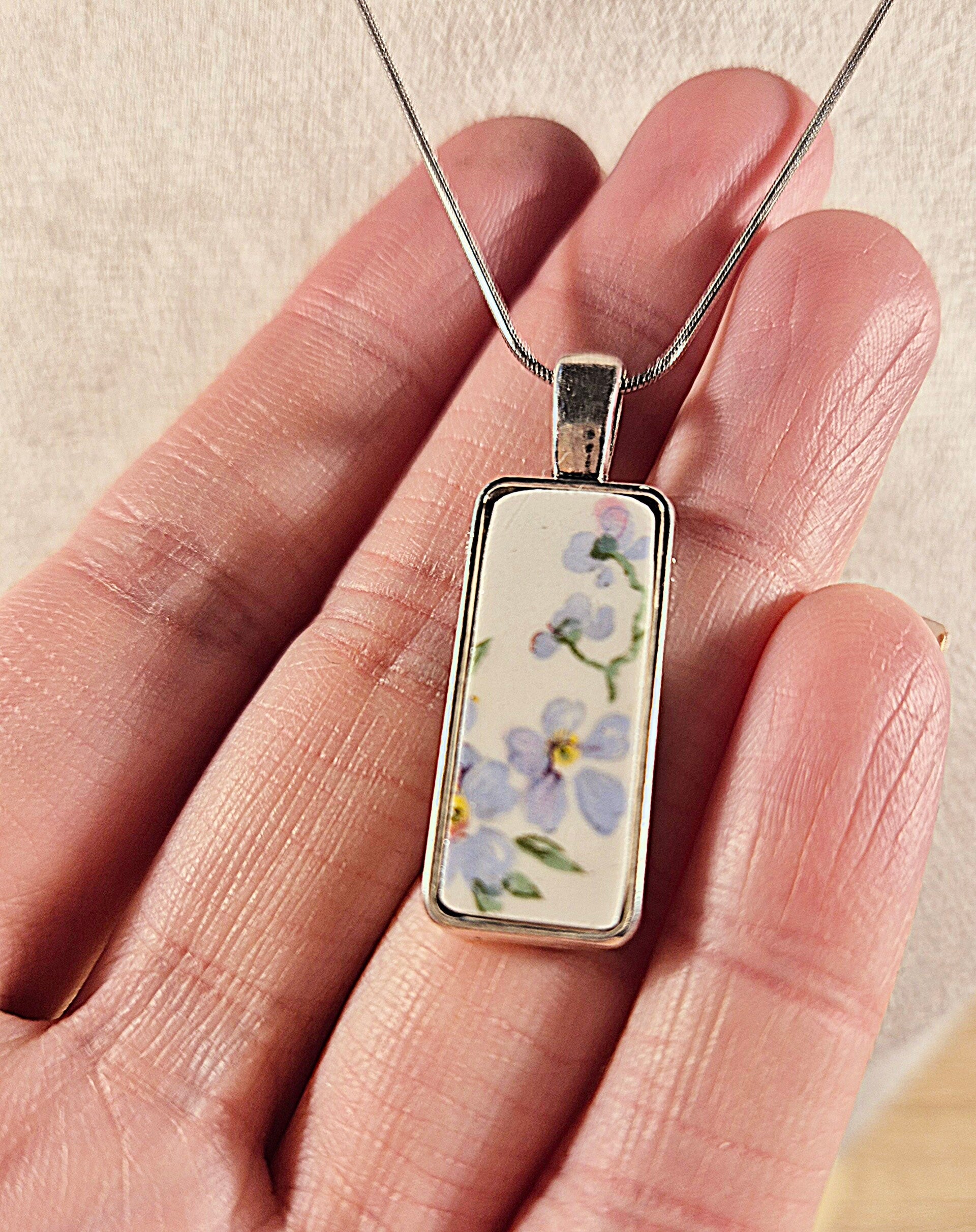 Ce pendentif artisanal est réalisé à partir d’un fragment d’assiette ancienne en faience soigneusement découpé et poli à la main. Chaque pièce est unique, révélant les motifs délicats et les couleurs authentiques de la vaisselle d’autrefois.