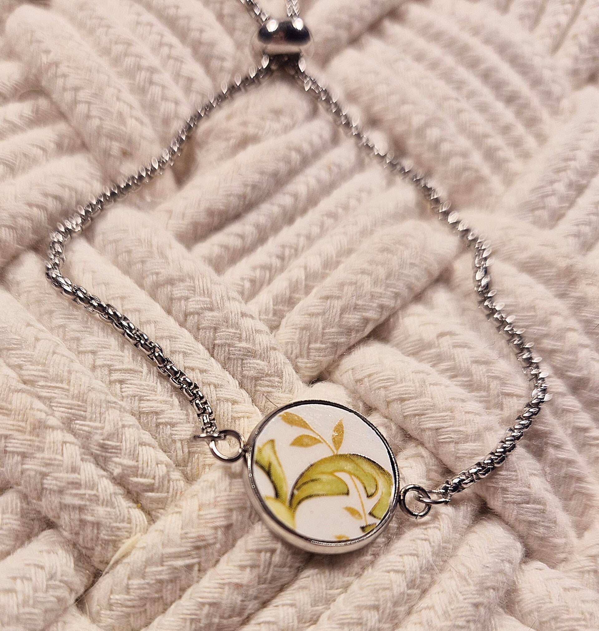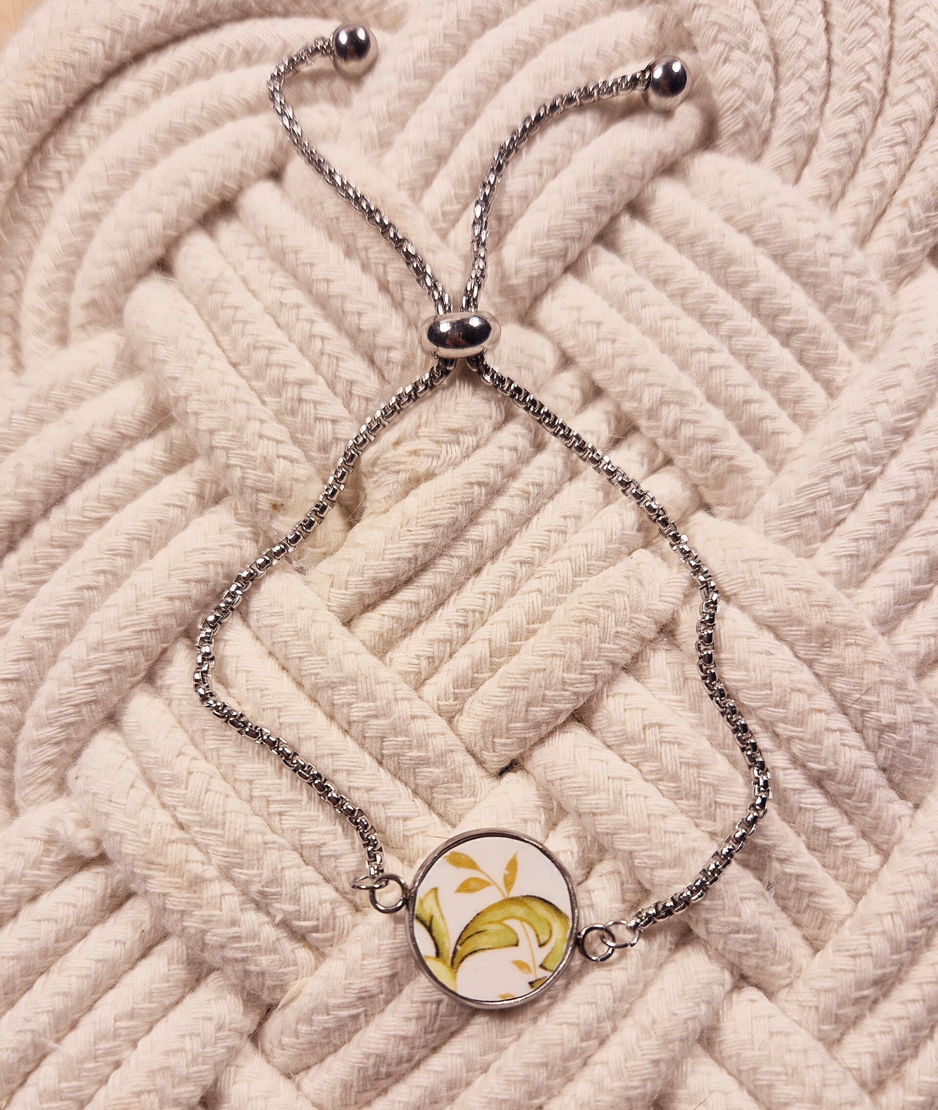 Ce bracelet fait main est conçu à partir d’un fragment d'assiette ancienne, soigneusement découpé et poli pour révéler toute la beauté de ses motifs d’origine.