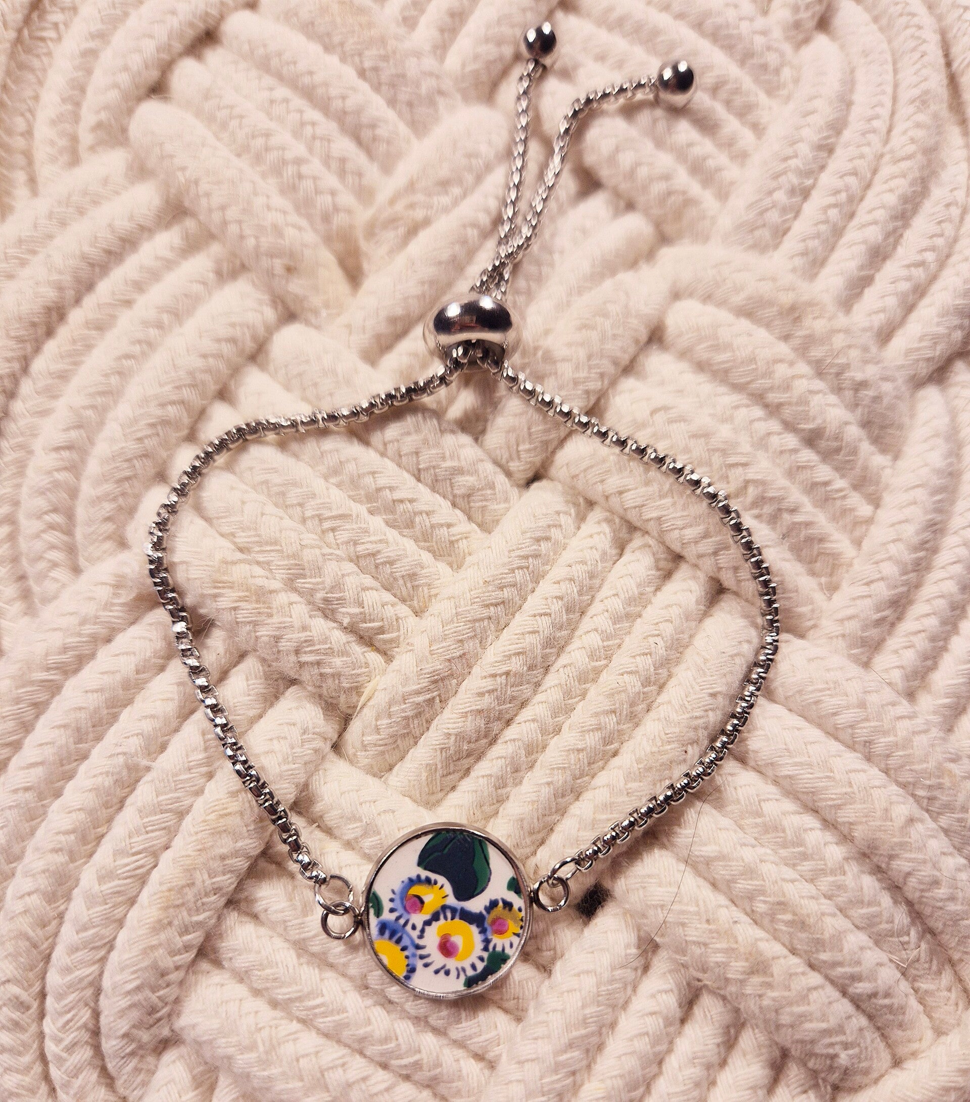 Ce bracelet fait main est réalisé à partir d’un fragment d’assiette ancienne, soigneusement découpé, poli et transformé en un bijou artisanal plein de charme. Chaque morceau de d'assiette conserve ses motifs d’origine, témoins d’un savoir-faire d’autrefois, pour un rendu authentique et élégant.