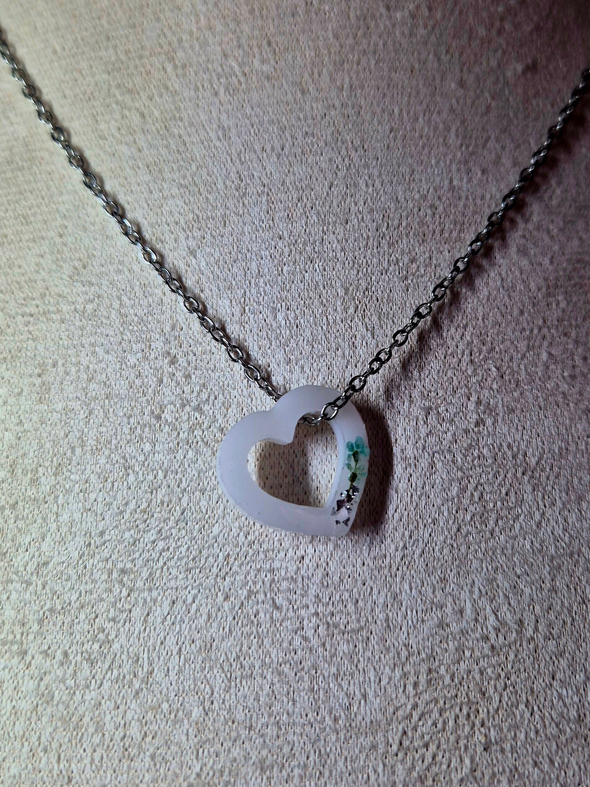 Ce pendentif en forme de cœur (16x16 mm) est réalisé à la main à partir de votre lait maternel, avec de délicates fleurs séchées et quelques paillettes argentées pour une touche lumineuse. Chaque bijou est unique, car la couleur du lait varie naturellement du blanc pur au blanc cassé.